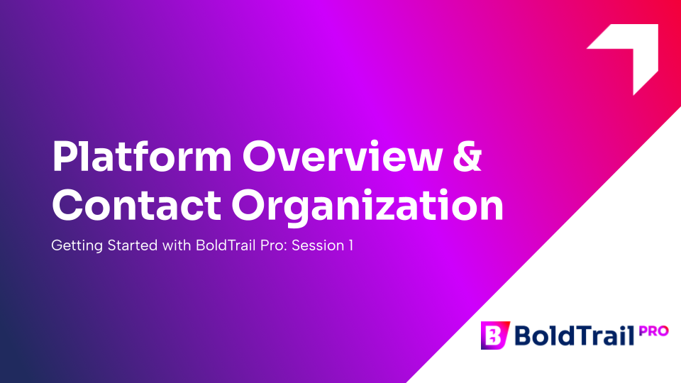 After this webinar a BoldTrailPRO user will understand the platform components that make up their BoldTrailPRO account and find additional training, community and support resources. A BoldTrailPRO user will also be able to find and identify a contact record as well as understand how to organize their contacts and save filters to start managing their database.